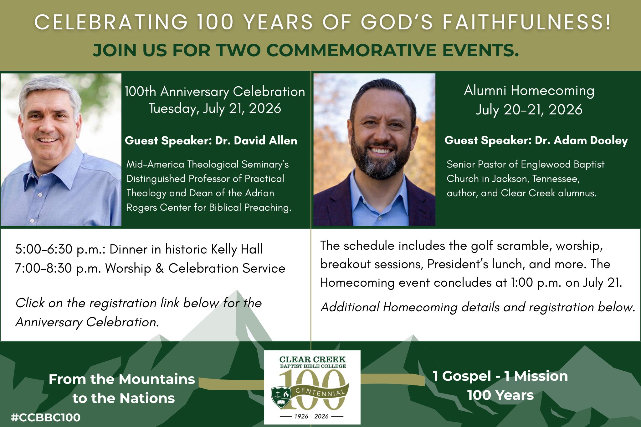 We are eagerly anticipating CCBBC Homecoming as we mark 100 years of God’s faithfulness! This historic celebration is a once-in-a-century opportunity for alumni, current students, and friends of Clear Creek to gather, reconnect, and celebrate all God has done through the years. You will not want to miss this momentous event. Details and registration information are provided below.